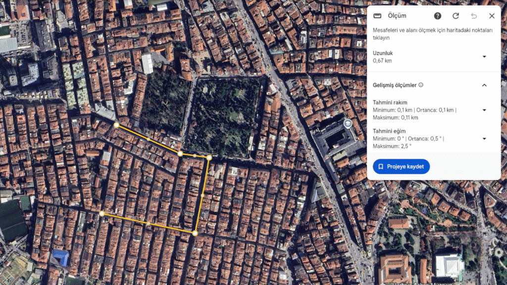 - Üst menüdeki cetvel ikonuna tıklayarak ölçüm aracını başlatın. Harita üzerinde noktalar belirleyerek mesafeyi, bir alanı çevreleyerek ise o bölgenin yüzölçümünü kolayca hesaplayabilirsiniz. Bu özellik, özellikle hobi amaçlı arazi incelemeleri, yürüyüş rotaları oluşturma veya sadece meraktan kaynaklanan ölçümler için paha biçilmezdir.