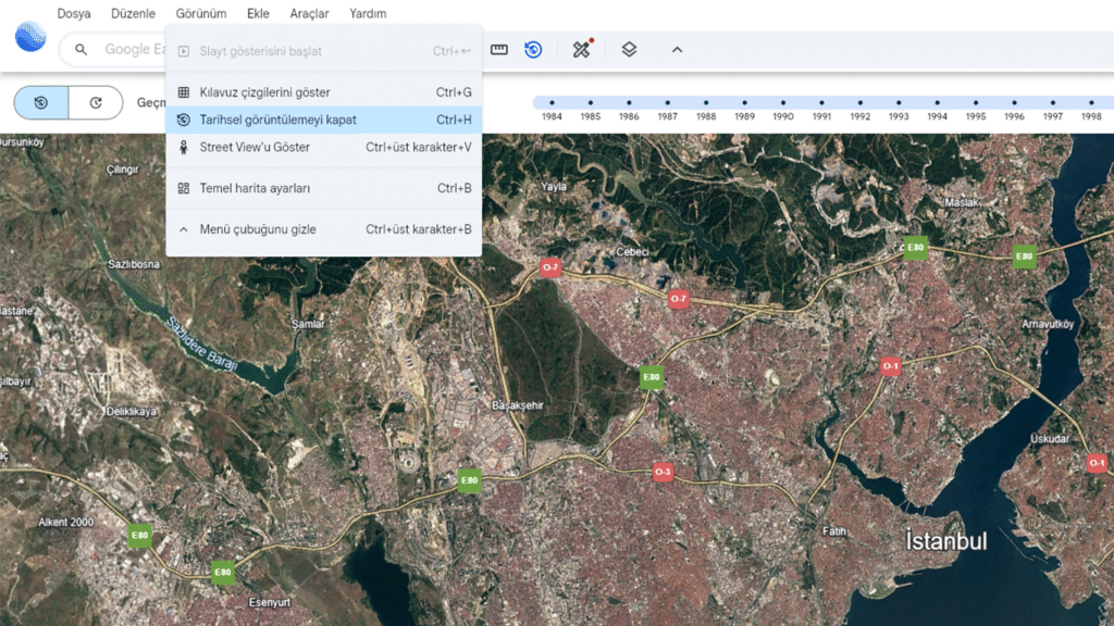 - Google Earth Web: İlgilendiğiniz bir konuma gidin. Ctrl + H (Windows) veya Command + H (Mac) kısayolu ile ya da üst menüdeki “Görünüm” sekmesinden “Tarihsel Görüntülemeyi Göster” seçeneğine tıklayın. Ekranda beliren zaman kaydırma çubuğu ile istediğiniz yıla gidebilirsiniz.