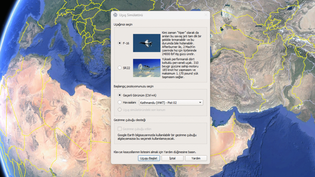 İşte en iyi saklanan sırlardan biri! Google Earth’ün masaüstü versiyonu olan Google Earth Pro, içinde gizli bir uçuş simülatörü barındırır. F-16 veya pervaneli SR22 uçaklarından birini seçerek dünyanın herhangi bir yerinden havalanabilir, şehirlerin üzerinde süzülebilir veya görkemli dağların arasından geçebilirsiniz.
